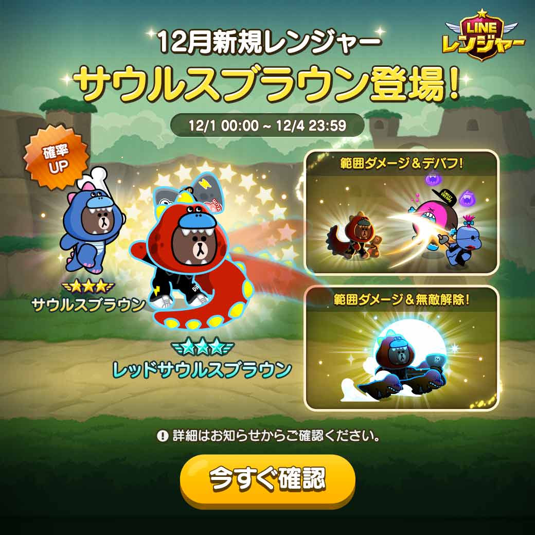 Line レンジャー No Twitter 新規レンジャー登場 恐竜の姿になった新規レンジャー ブラウン が登場 今なら サウルスブラウン と レッドサウルスブラウン のガチャ確率がup中なのです かっこよくて強いサウルスブラウンをお見逃しなく T